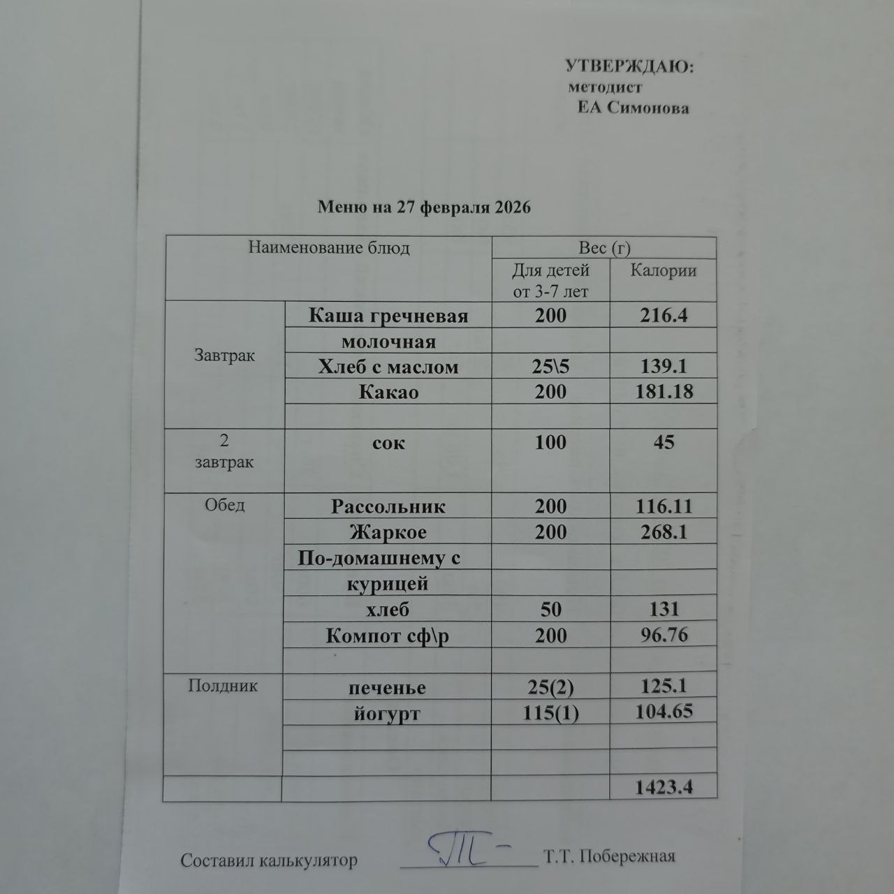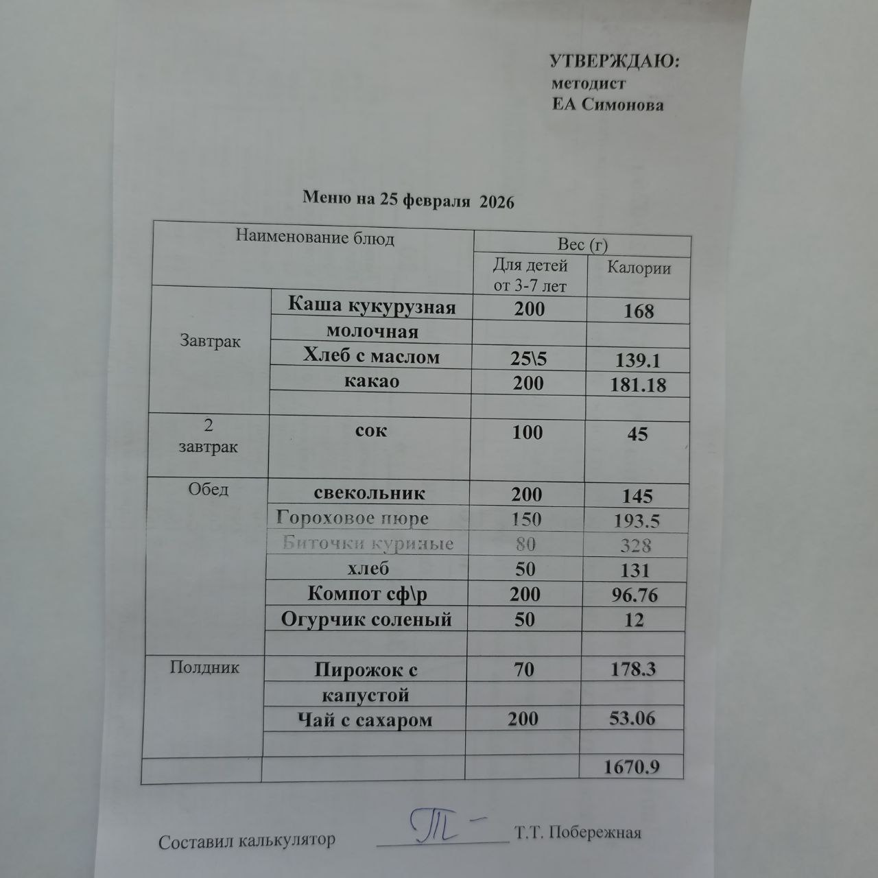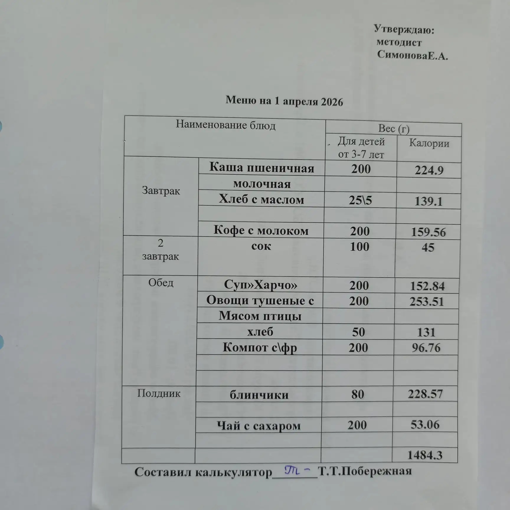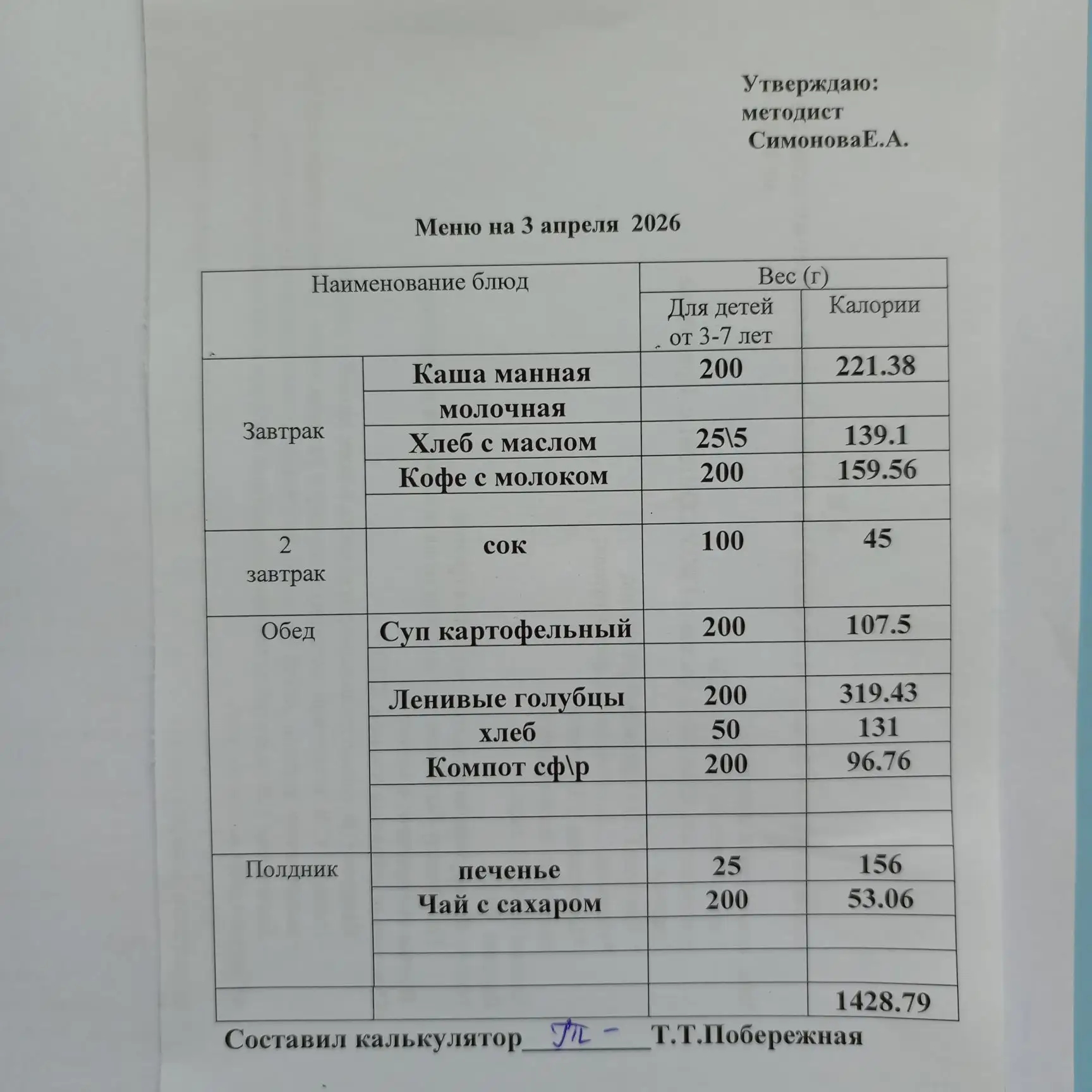 Утвержденное ежедневное меню: соответствует примерному десятидневному меню приготавливаемых блюд. Информация для родителей вывешивается на информационных стендах ежедневно.
