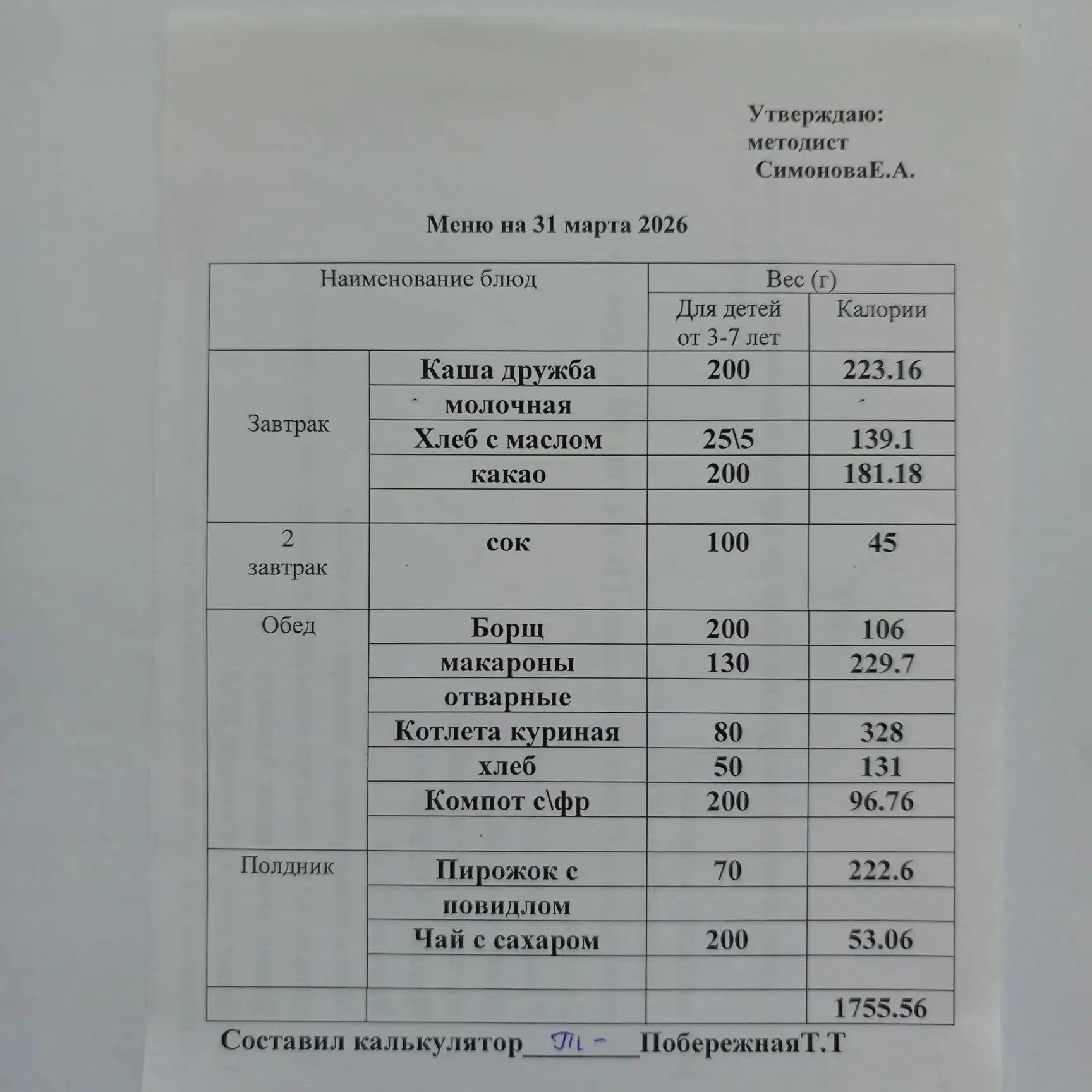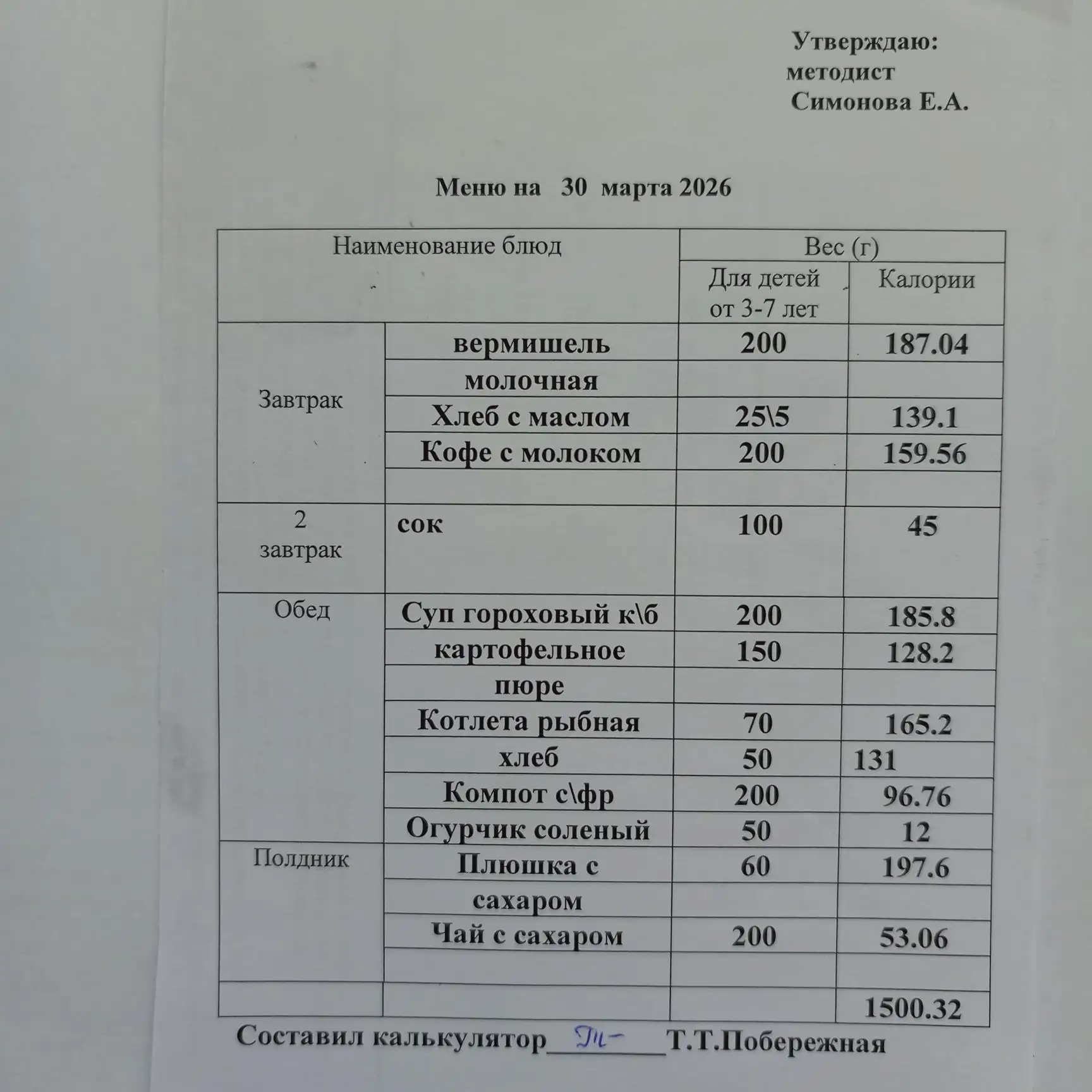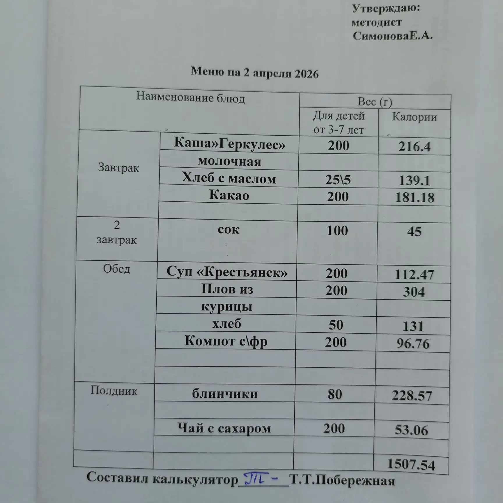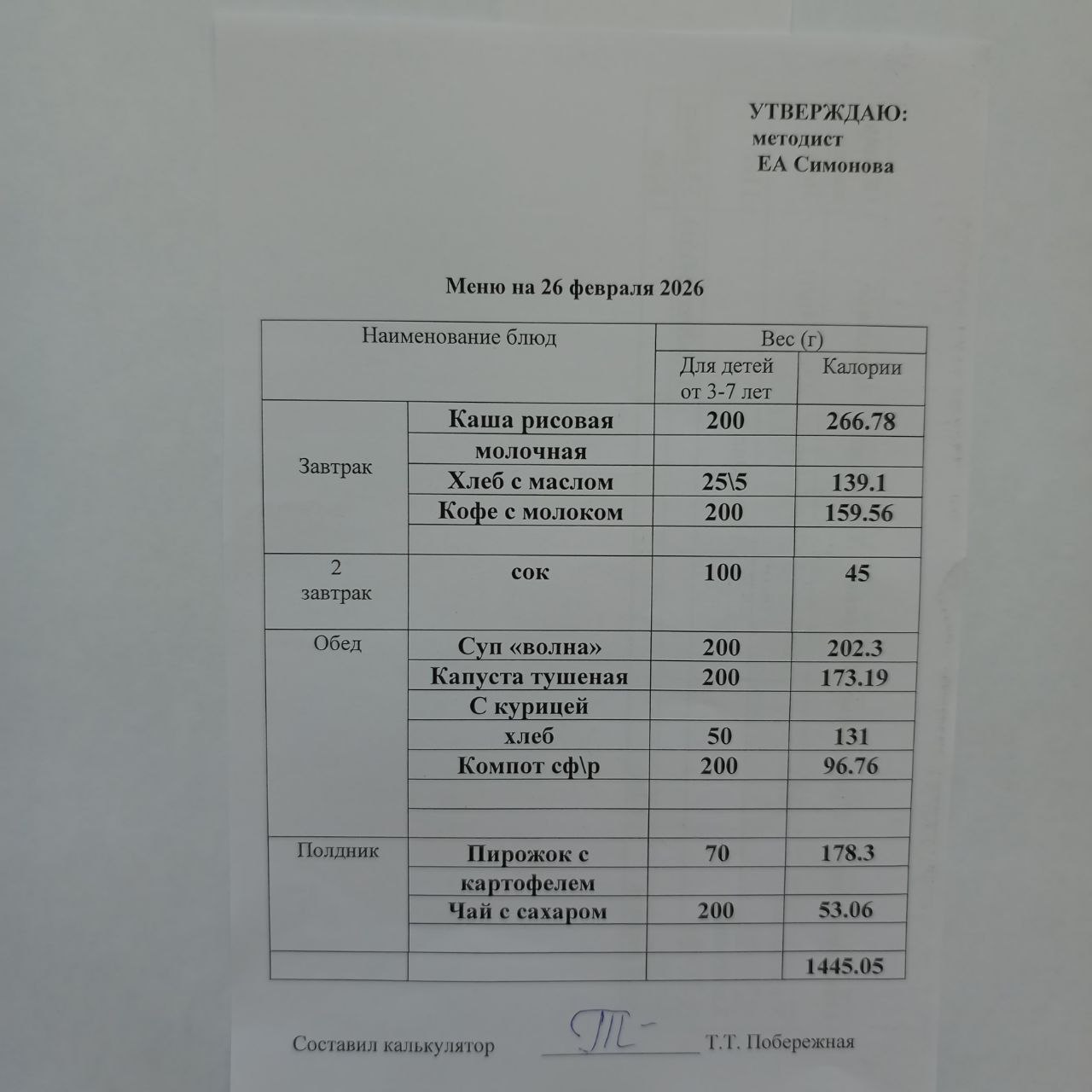 Утвержденное ежедневное меню: соответствует примерному десятидневному меню приготавливаемых блюд. Информация для родителей вывешивается на информационных стендах ежедневно.