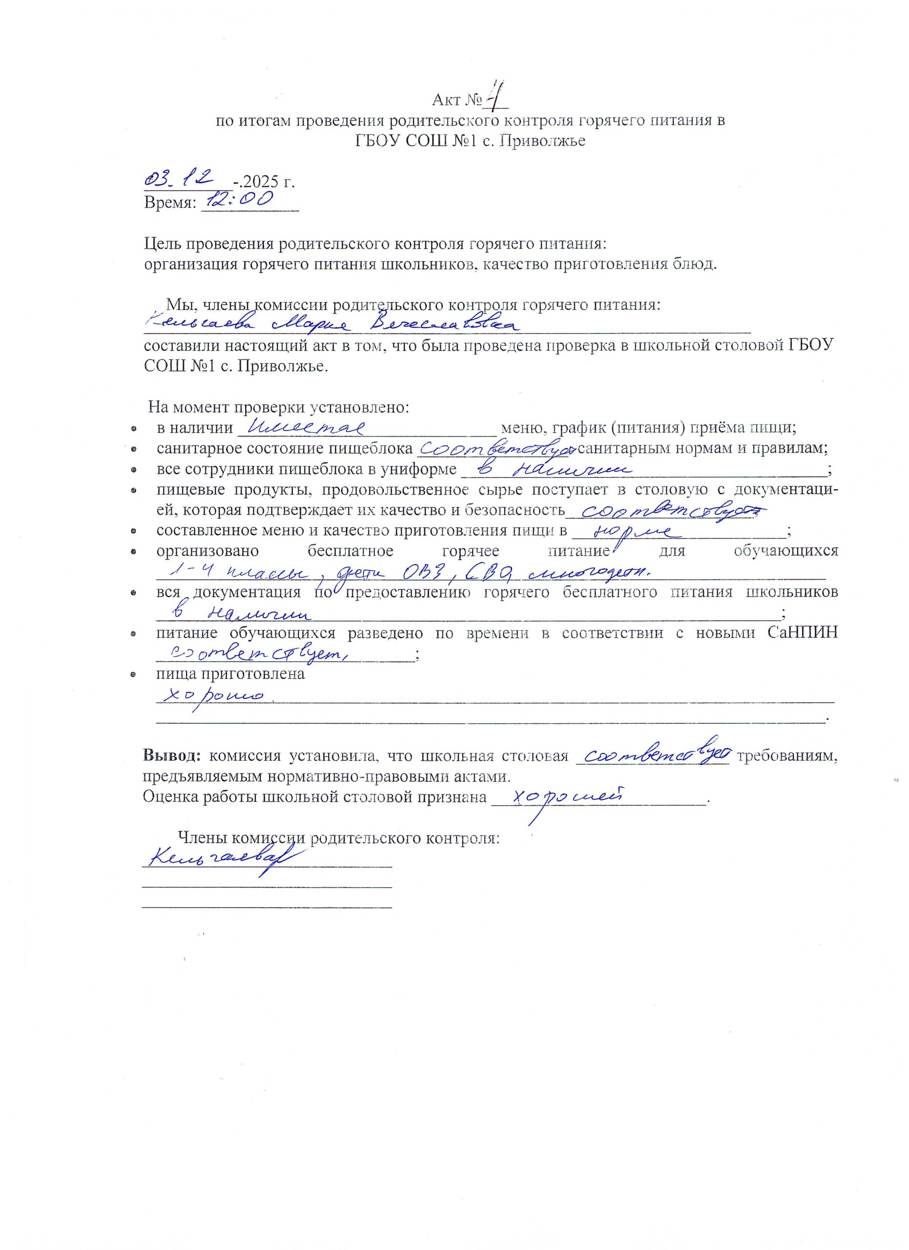 Родительский контроль за организацией питания учащихся ( Акты проверок 2025-2026 учебный год)